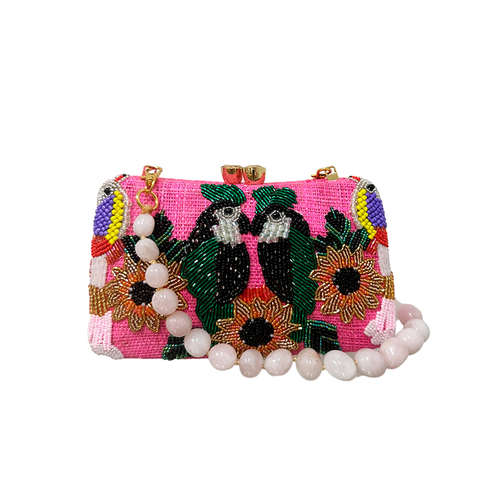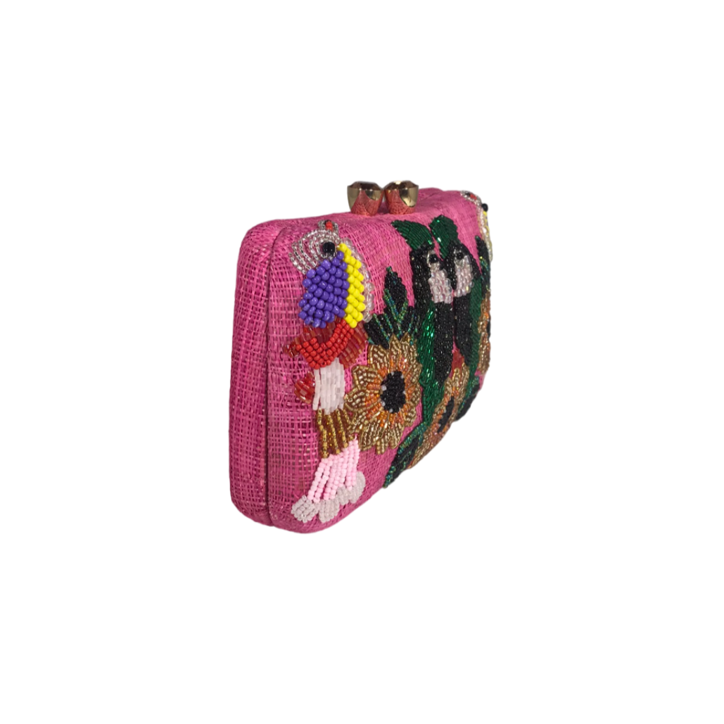 Charlotte clutch bag in birds beaded straw